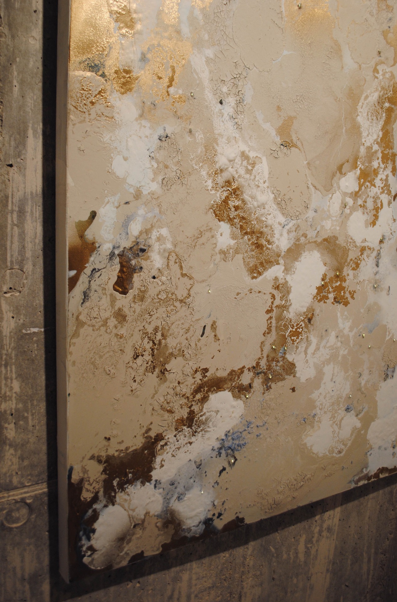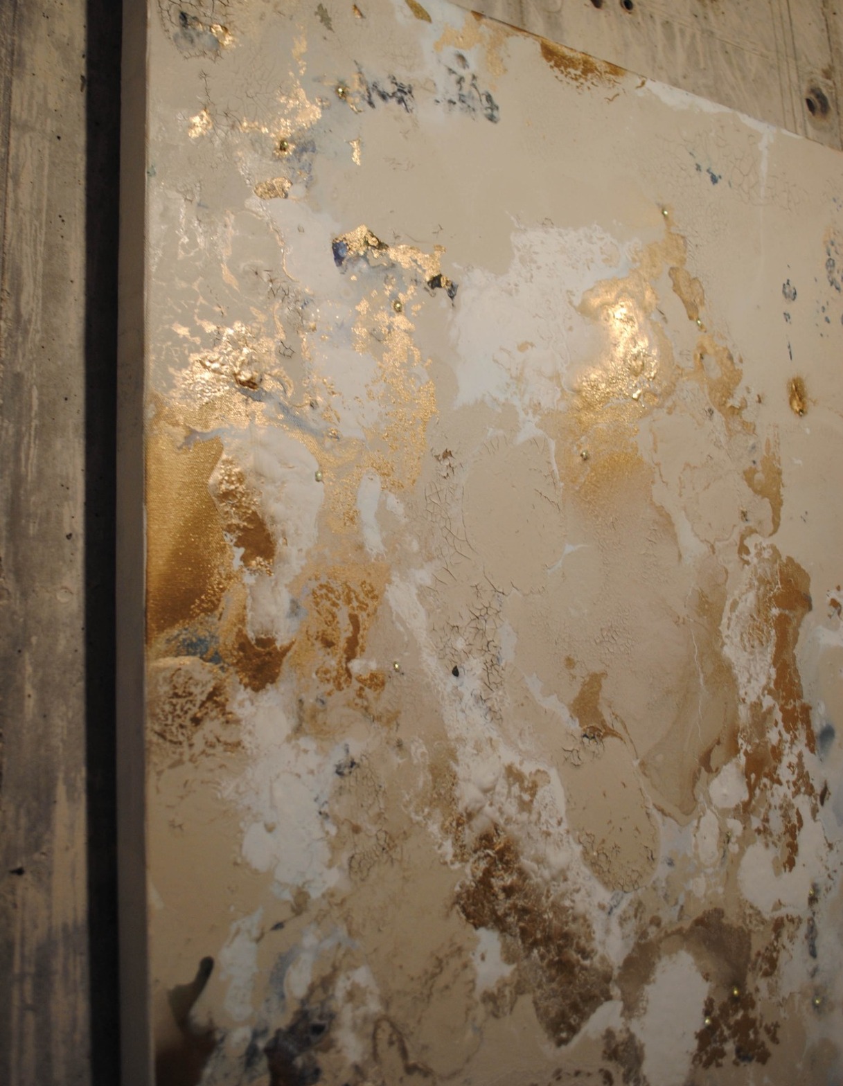 Ideally, the viewer should associate a figure with each color field in the painting and compose the final scene themselves. My color fields are avatars of figures, their placeholders. The LED lights and golden spray stains are the thread that connects the scene—they are active participants.